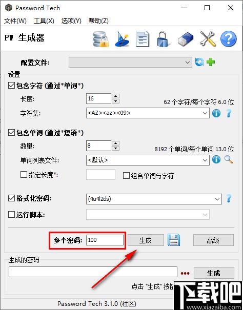 4、然后设置生成密码的数量,默认生成100个,设置完数量之后点击“生成”按钮。